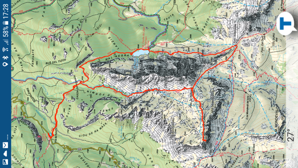 Raggiunta San Francesco in Val d’Arzino si parcheggia in località Galants e ci si incammina sul sent. 810 che sale su pista forestale fino a Sella Giaf (ricovero). Da qui si scende fino ai ruderi di Case Piedigiaf, dove incontriamo il torrente Comugna (guado).